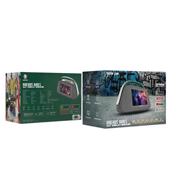 بلندگوی نمایشگر Green Lion Buenos Aires دستگاهی است که میتواند صدای قدرتمند و انعطافپذیری چندمنظوره را در یک طراحی زیبا ترکیب کند. این بلندگو با داشتن یک باتری لیتیوم-یونی 8000 میلیآمپرساعتی، تا 8 ساعت عمر باتری را فراهم میکند. بلوتوث نسخه 5.3 برای سهولت استفاده بیسیم از حدود 10 متر در دسترس است. این بلندگوی قدرتمند 80 واتی میتواند صدای کامل و جامعی را با بلندگوهای سهگانه، میانرده و باس برای یک تجربه صوتی 2.1 تولید کند. صفحه نمایش لمسی ۱۰.۱ اینچی HD با وضوح ۱۳۶۶×۶۰۰ و نسبت تصویر ۱۶:۹، تصاویری واضح را ارائه میدهد و از اندروید ۱۳.۰ برای رابط کاربری یکپارچه استفاده میکند. وایفای از شبکههای ۲.۴ گیگاهرتز و ۵ گیگاهرتز پشتیبانی میکند تا اتصال به سرویسهای استریم را تضمین کند. این بلندگو دارای چندین پورت ورودی – USB، AUX، HDMI، TFCard – است و حتی میتواند ورودی گیتار را نیز فراهم کند!