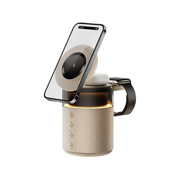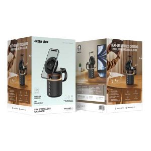 شارژر بیسیم Green Lion 5 in 1 یک راهکار شارژ همهکاره است که برای سادهسازی تنظیمات فنی شما طراحی شده است. این شارژر همهکاره با حداکثر توان ورودی ۲۷ وات، از چندین دستگاه به طور همزمان پشتیبانی میکند. این شارژر، شارژ سریع گوشی شما را با توانهای ۱۵، ۱۰، ۷.۵ و ۵ وات ارائه میدهد. این بدان معناست که دستگاه شما به سرعت و به طور کارآمد شارژ میشود. خروجی ساعت ۲.۵ وات و خروجی TWS 5 وات، آن را برای شارژ لوازم جانبی مختلف نیز ایدهآل میکند. بلندگوی داخلی با توان ۵ وات، با زمان پخش ۵ ساعته چشمگیر، به شما امکان میدهد هنگام شارژ از موسیقی لذت ببرید. اتصال بلوتوث V6.0 عملکرد روان و کنترل بیسیم را تضمین میکند و حالت نور محیط، حس آرامشبخشی را به فضای شما میبخشد. طراحی قابل تنظیم ۳۶۰ درجه، امکان قرارگیری انعطافپذیر را فراهم میکند، در حالی که ویژگی Snap & Charge استفاده از آن را فوقالعاده آسان میکند. این شارژر دارای باتری ۱۸۰۰ میلیآمپر ساعتی است. کاربردی و شیک است و آن را به انتخابی عالی برای تمام نیازهای شارژ شما تبدیل میکند.