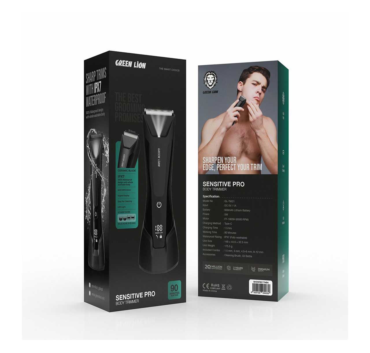اگر بخواهیم یکی از برترین محصولات گرین لاین را نام ببریم ماشین اصلاح گرین لاین مدل Sensitive Pro Body Trimmer بدون شک بهترین انتخاب است. در قسمت بالایی ،دارای چراغ LED می باشد که اصلاح را برای شما امری آسان و دقیق ترمی کند.ساختار این ماشین اصلاح به گونه ای است که به پوست شما صدمه نمیزند.اگر بخواهیم مشخصات فنی این ماشین اصلاح، را بگوییم ولتاژ آن 5 ولت/1 آمپر می باشد.موتور آن ۶۵۰۰ دور در دقیقه میباشد.قدرت این دستگاه 5 وات است.جنس بدنه پلاستیکی و جنس تیغه آلمینیومی می باشد. مدت زمانی که طول می کشد این دستگاه شارژ شود 1.5 ساعت می باشد و شما می توانید مدام از آن استفاده کنید. همچنین تا 90 دقیقه به راحتی کار می کند.