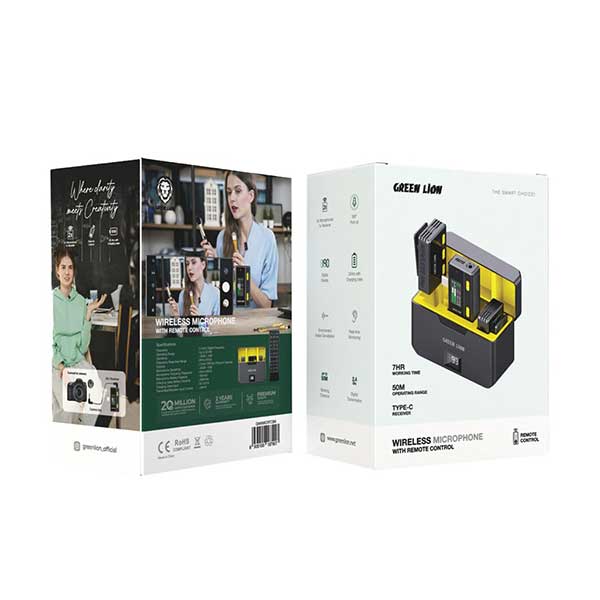 میکروفن یقه ای گرین لاین در دو مدل لایتنینگ و تایپ C با قابلیت حذف نویز و دارای ریموت کنترل امکان ضبط صدا تا فاصله 50 متر را دارد. میکروفن بی سیم green lion smart choice توسط کابل نیز به دوربین های DSLR متصل می شود و در فرکانس 2.4GHz کار می کند. 8 ساعت کارکرد عادی برای هر میکروفن مجزا اندازه گیری شده است. نویز کنسلینگ از مهم ترین ویژگی این مدل است.