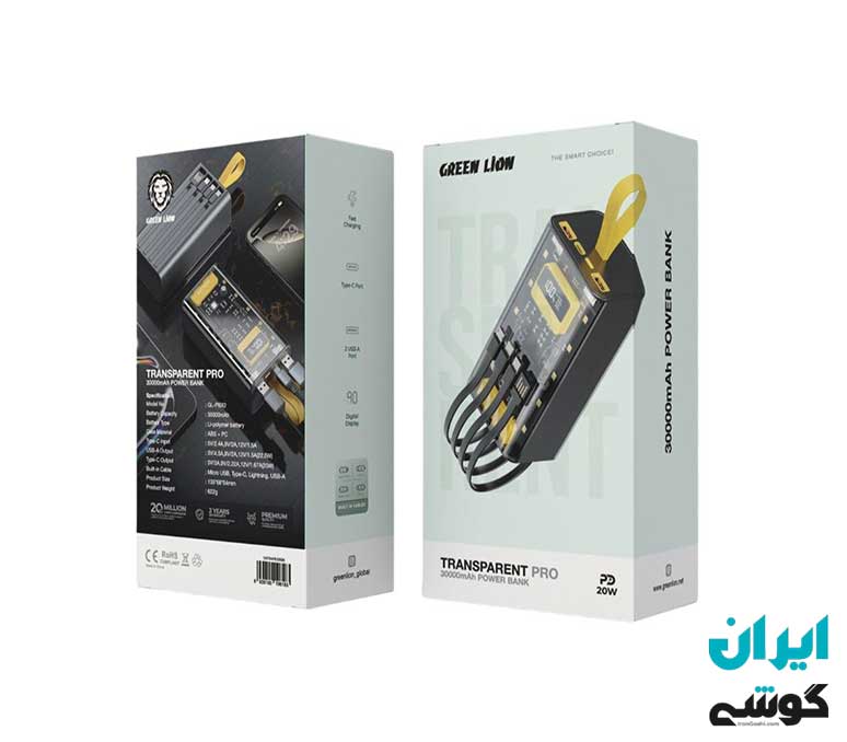 پاوربانک Green Lion Transparent Pro 30000mAh پاور بانکی است که قابلیت شارژ بسیار عالی و سریع را ارائه می دهد. این باتری لیتیوم پلیمری خوب 30000 میلی آمپری دارد که باعث میشود انرژی بسیار طولانی دوام بیاورد در حالی که کاربر میتواند از آن لذت ببرد. جنس بدنه ABS + PD دوام محصول را فراهم می کند. دارای ورودی Type-C (5V/2.4A، 9V/2A، 12V/1.5A) در حالی که خروجی USB-A برای 5V/4.5A، 9V/2A، 12V/1.5A برای ارائه سرعت شارژ سریع مناسب است. خروجی Type-C شارژ سریع 20 واتی را به ارمغان می آورد، در حالی که کابل های داخلی مانند Micro USB، Type-C، Lightning و USB-A، استفاده از آن را با دیگران آسیب پذیر و چالش برانگیز نمی کند. از آنجایی که نمایشگر دیجیتالی نیز دارد که به شما امکان می دهد وضعیت باتری را در زمان واقعی نظارت کنید.