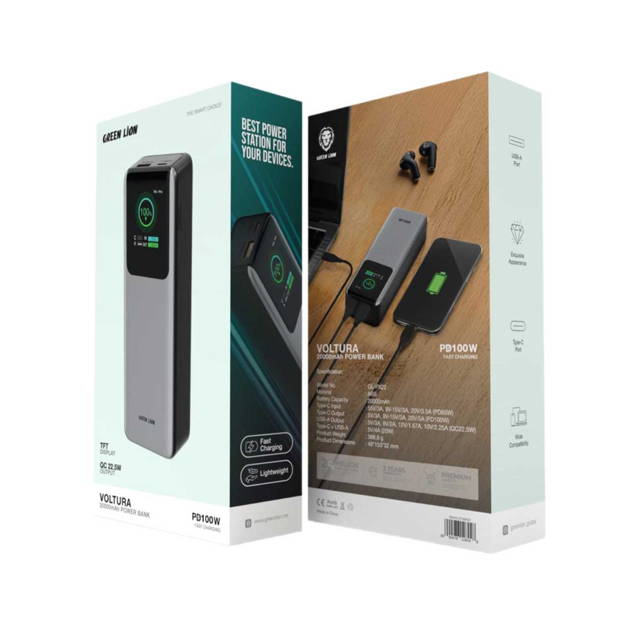 پاوربانک Green Lion Voltura 20,000mAh PD100W دارای طراحی جمع و جور و قدرتمندی است و قدرت بالا و شارژ سریع را ارائه میدهد. باتری 20000 میلیآمپر ساعتی آن برای تأمین انرژی دستگاههای شما به اندازه کافی خوب است. ورودی و خروجی Type-C (PD100W) از شارژ سریع در 5V/3A، 9V-15V/3A و 20V/5A پشتیبانی میکند. خروجی USB-A با QC22.5W از شارژ سریع سایر دستگاهها مانند تلفنهای هوشمند پشتیبانی میکند. این پاوربانک همچنین دارای پورتهای Type-C + USB-A برای راحتی شارژ جهانی است. صفحه نمایش TFT آن به شما امکان میدهد وضعیت شارژ را کنترل کنید و ظاهر سبک و دوستداشتنی آن حمل آن را آسان میکند و سازگاری گستردهای با دستگاههای مختلف دارد. مناسب برای کسانی که در حال حرکت به شارژ سریع و پایدار نیاز دارند.