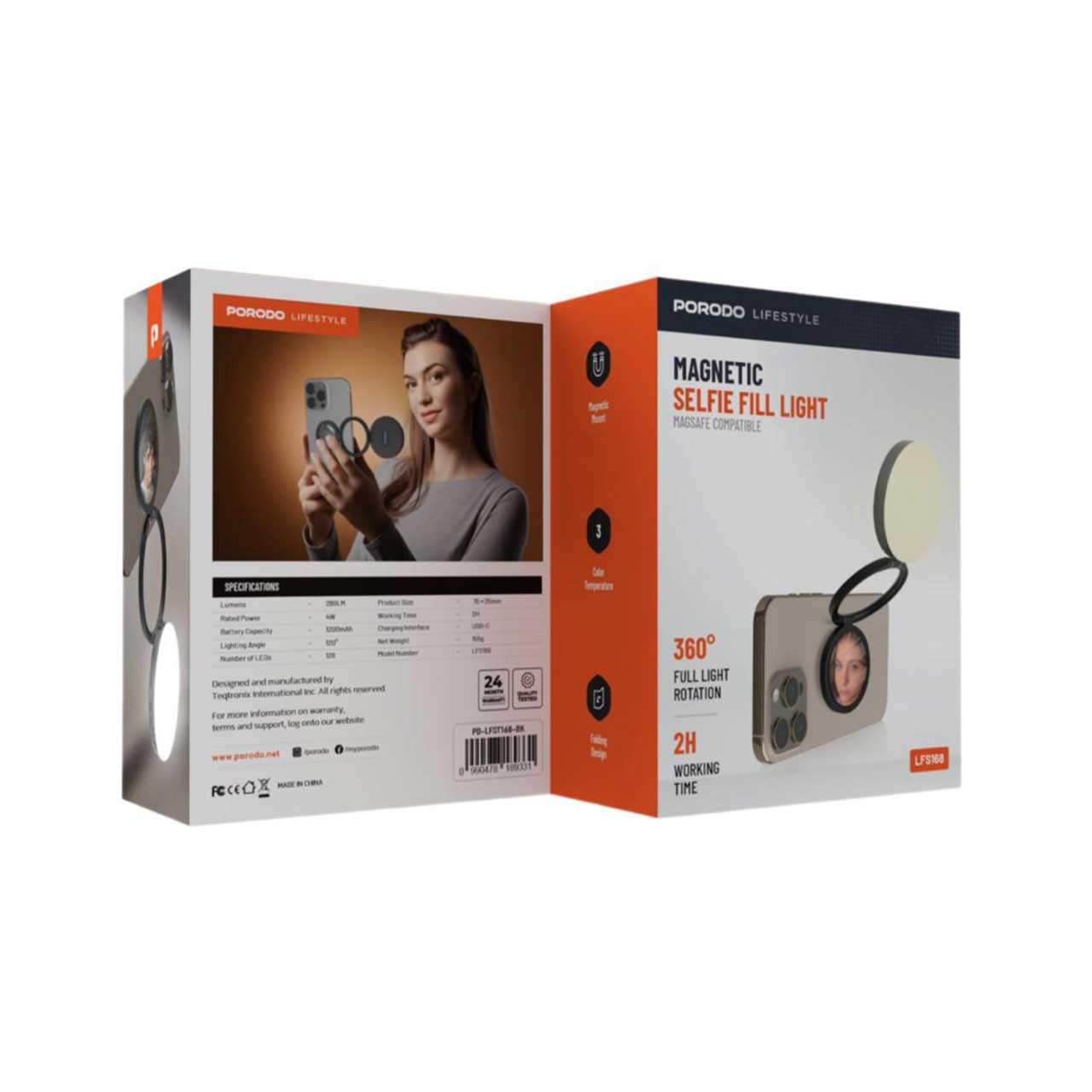 چراغ سلفی مغناطیسی Porodo Lifestyle یک دستگاه چند منظوره و قدرتمند است که نورپردازی بینظیری را برای عکسها و تماسهای ویدیویی شما فراهم میکند. با زاویه روشنایی ۱۲۰ درجه و ۱۲۶ LED درخشان، ۲۸۰ لومن نور تولید میکند تا به طور یکنواخت محتوای تولید شده شما را برجسته کند. این چراغ دارای سه دمای رنگ قابل تنظیم است. این به شما امکان میدهد تا حال و هوای یک اثر طبیعی و دلپذیر را تنظیم کنید. این چراغ به راحتی روی تلفن هوشمند شما قرار میگیرد. این امکان تنظیمات سریع را فراهم میکند. پایه مغناطیسی و سازگاری با MagSafe استفاده از آن را ساده میکند. این چراغ جمع و جور ۴ وات نیرو تولید میکند و ۲ ساعت دوام میآورد. این چراغ دارای یک باتری ۱۲۰۰ میلیآمپر ساعتی است که از USB-C برای شارژ استفاده میکند. به علاوه، طراحی تاشو و چرخش ۳۶۰ درجه آن، آن را برای نورپردازی در حال حرکت ایدهآل میکند. چراغ سلفی مغناطیسی Porodo Lifestyle ابزاری عالی برای هر کسی است که میخواهد سلفیها، چتهای ویدیویی و تولید محتوا را بهبود بخشد، زیرا سهولت، سبک و کاربرد را با هم ترکیب میکند.